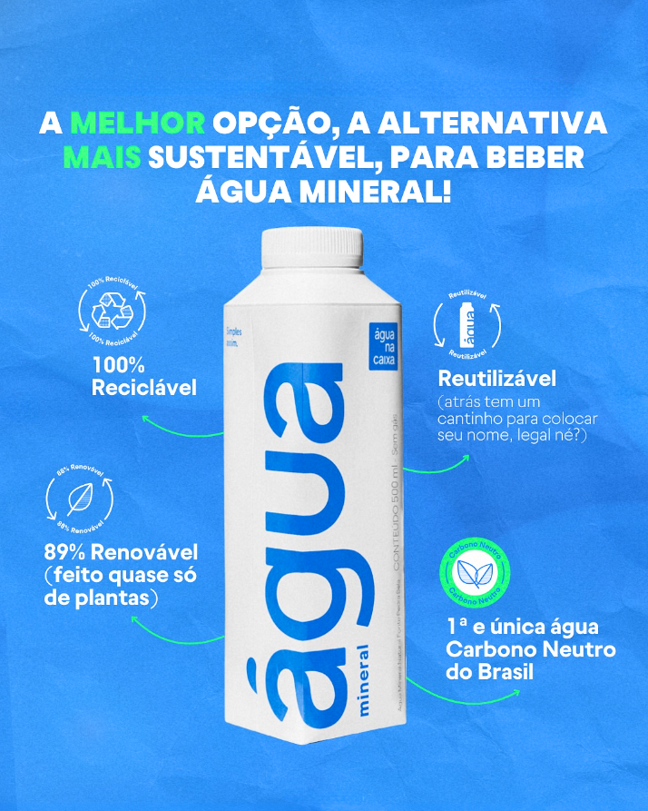 A Água na Caixa nasceu com o propósito de transformar a maneira como consumimos água, unindo praticidade, responsabilidade ambiental e impacto social. Somos a primeira e única água mineral carbono neutro do Brasil, envasada em embalagens 100% recicláveis e compostas por 88% de materiais renováveis, como papel e plástico de cana-de-açúcar.